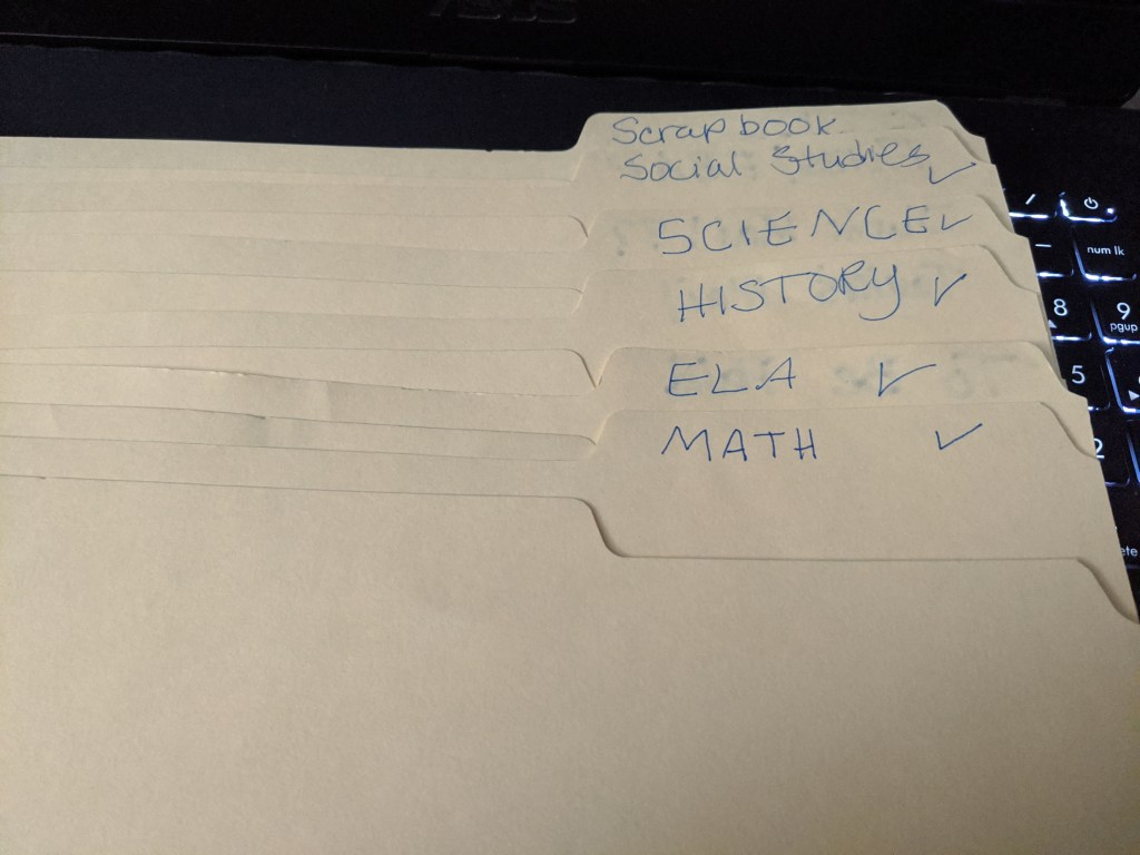 I just simply make file folders for each subject to place any work that has been submitted to the online teachers. Cyber space (and an absentminded grammie) can lose uploaded work once in a while, so I want to make sure I always have this as a backup. I’ve also included a file for scrapbook special work or journal pages as I’m making a “yearbook” for our granddaughter this year.